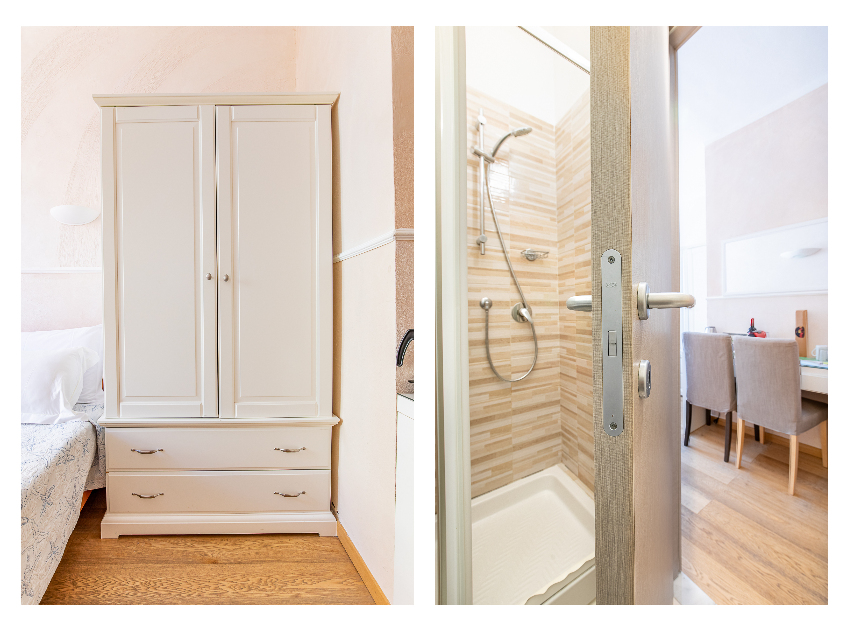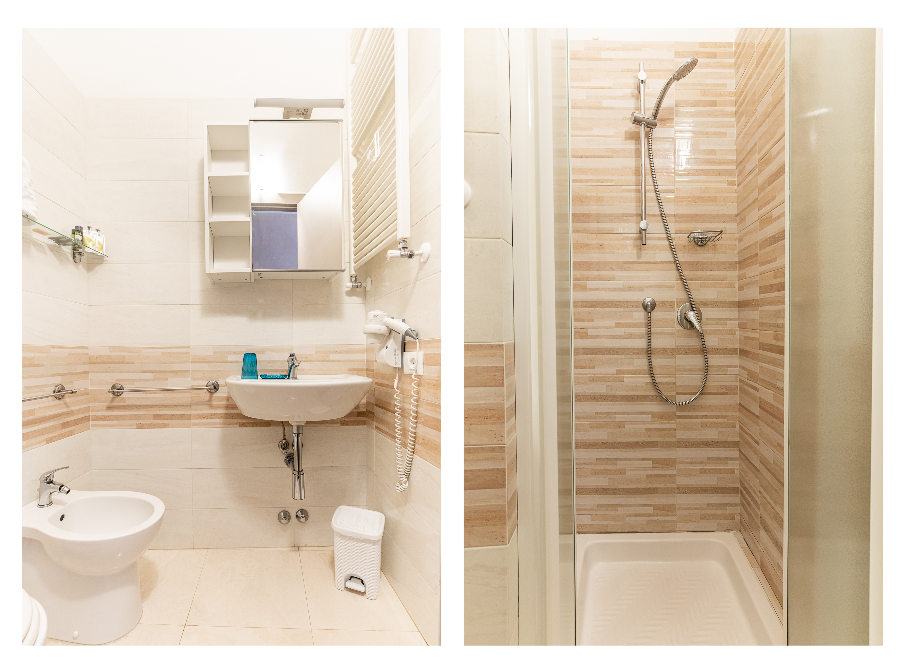 La camera è dotata di ampio bagno privato con una grande doccia, asciugacapelli da muro, frigobar ...