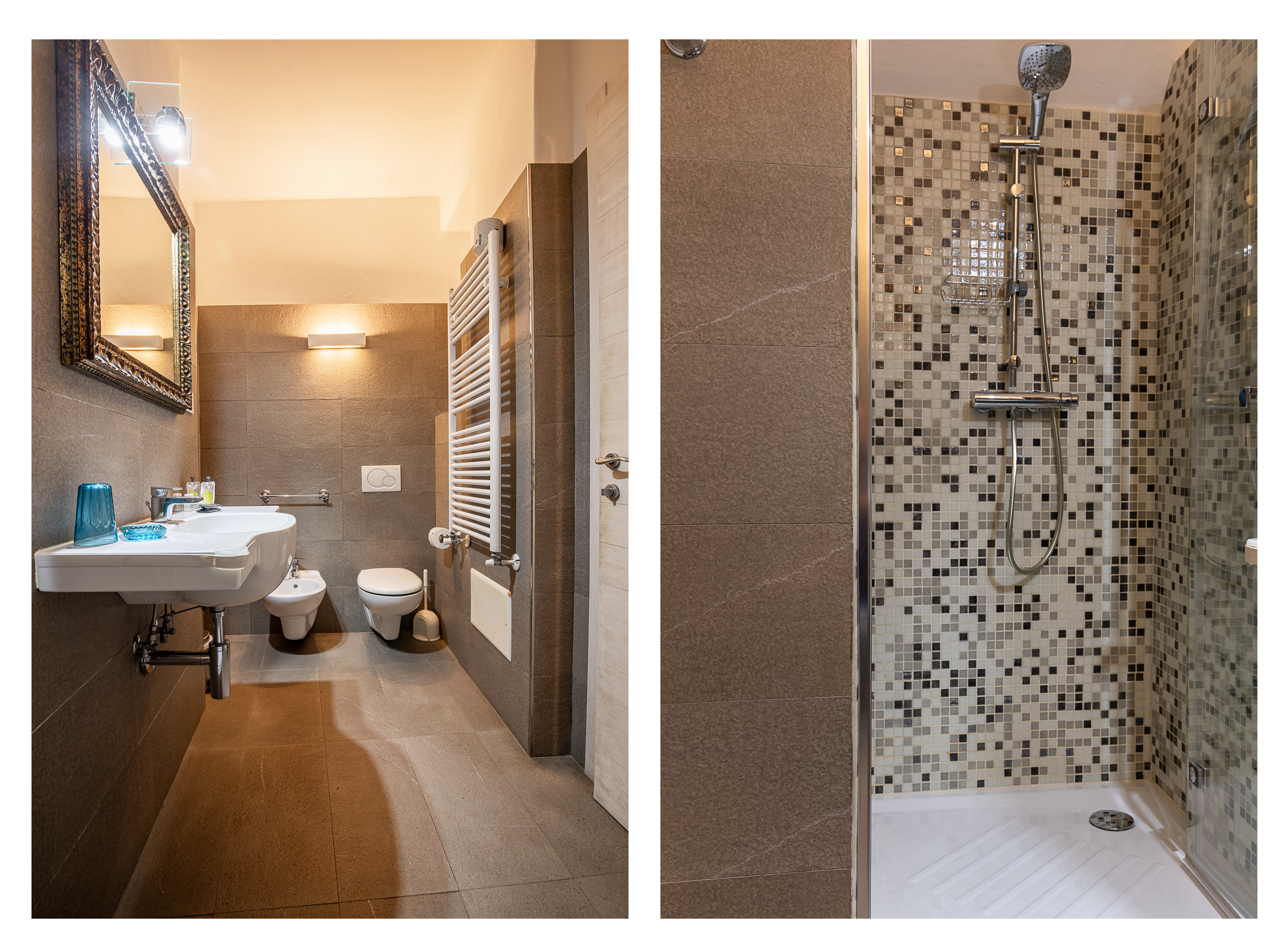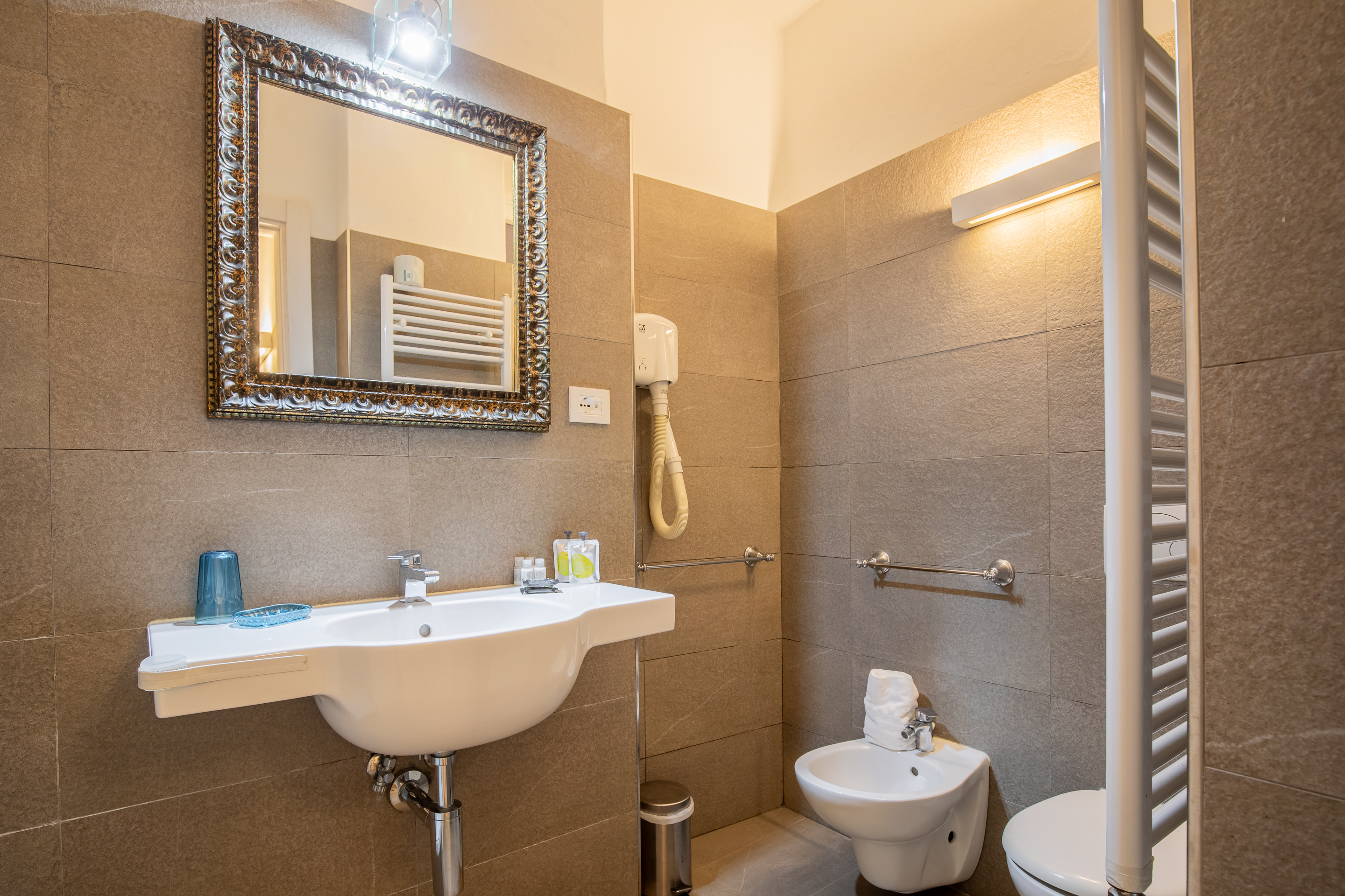 La camera è dotata di ampio bagno privato con una grande doccia, asciugacapelli da muro, frigobar ...